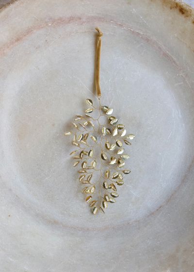 Branche décorative dorée faite à la main avec perles blanches et cordon en velours.
