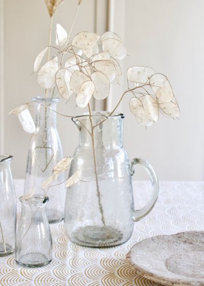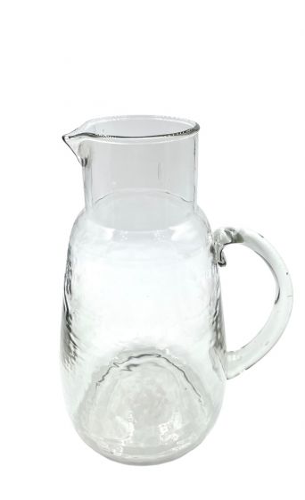 Carafe avec anse fabriquée à la main en verre transparent à l'aspect martelé.