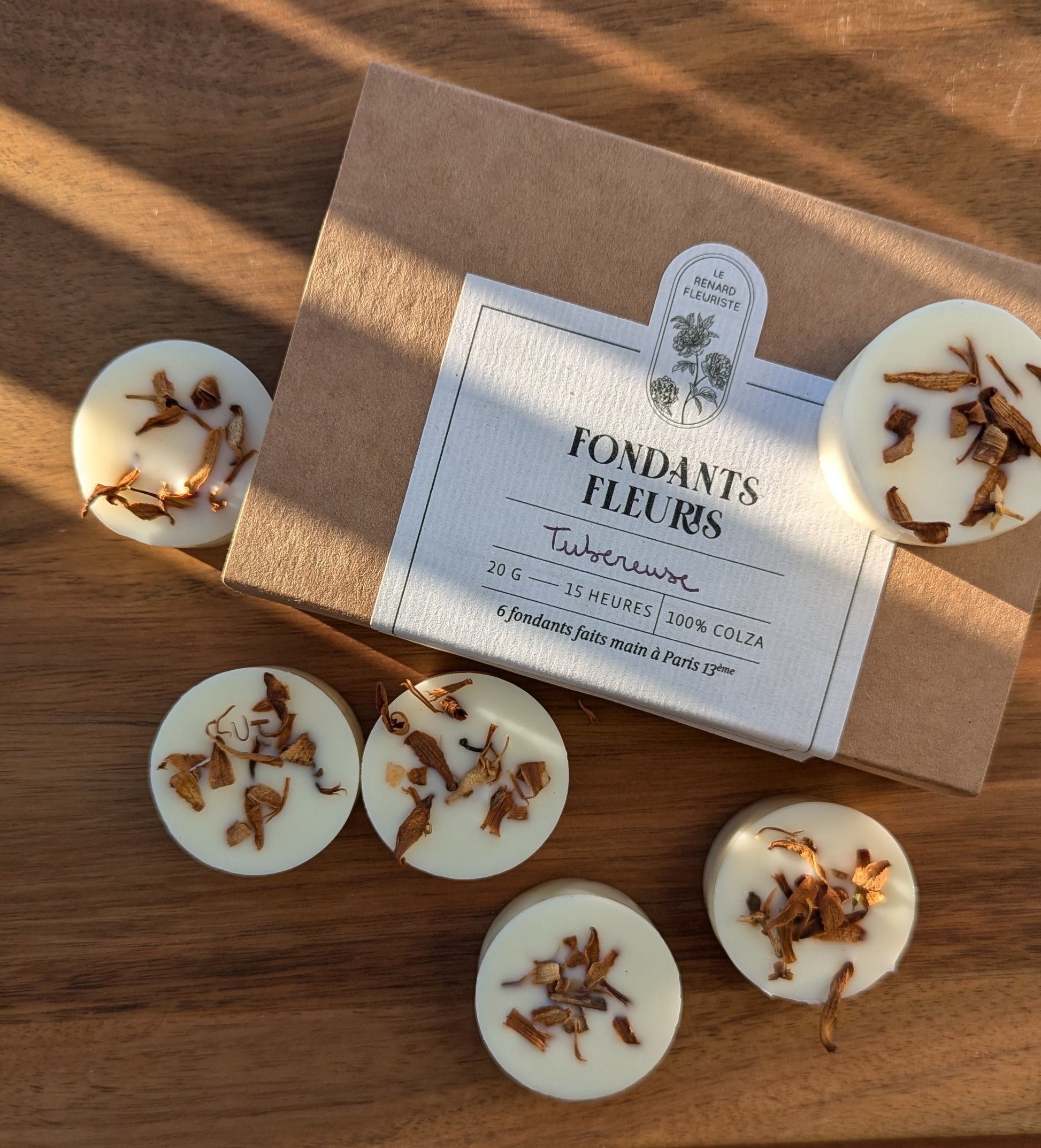 Découvrez nos fondants parfumés et fleuris, créés avec soin à partir de cire de colza de qualité supérieure et des parfums raffinés en provenance de Grasse, la capitale mondiale du parfum. Chaque fondant est fabriqué à la main dans notre atelier situé à Paris dans le 13ème arrondissement , garantissant une fabrication artisanale et un soin particulier apporté à chaque détail.